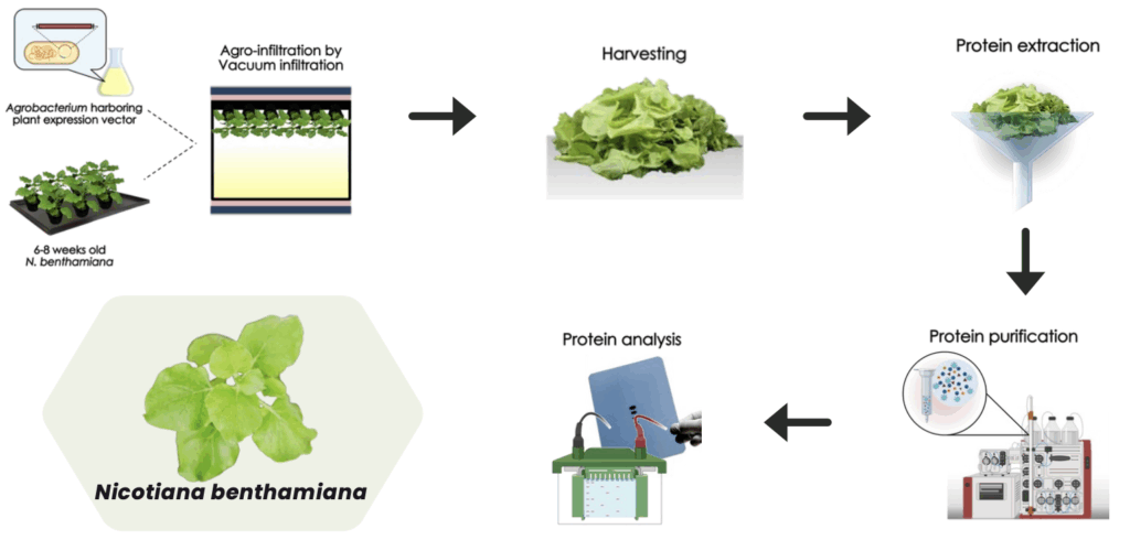 This method exists upon the relationship found in nature between Agrobacterium and Nicotiana benthamiana, a plant native to Australia. Via transient expression, Agrobacterium inserts a DNA plasmid into N. benthamiana, and the plant’s ribosomes work to transcribe and translate the DNA into protein in just a few days, providing a food source specially for the bacteria.