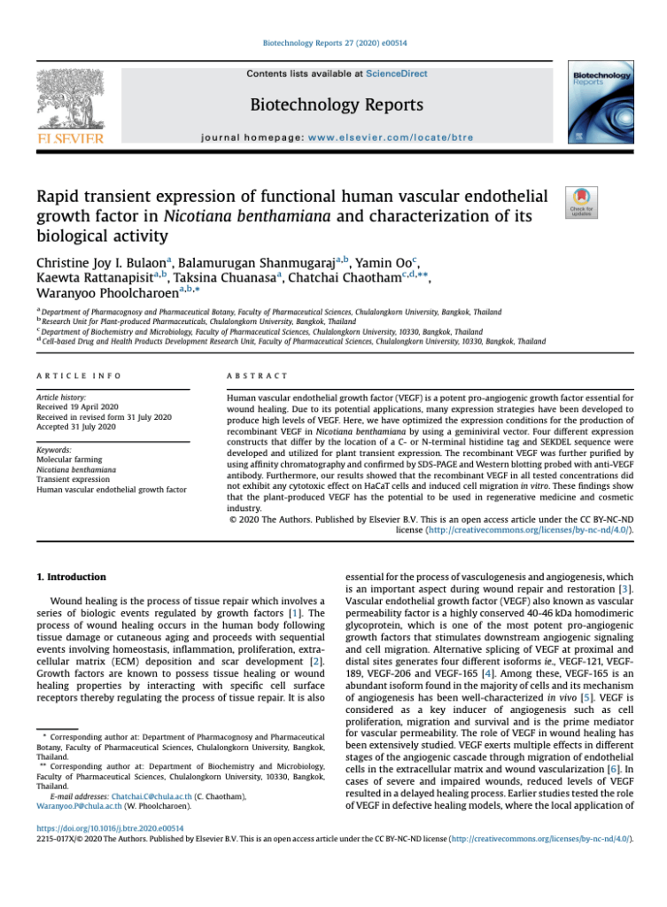 Rapid transient expression of functional human vascular endothelial growth factor in Nicotiana benthamiana and characterization of its biological activity